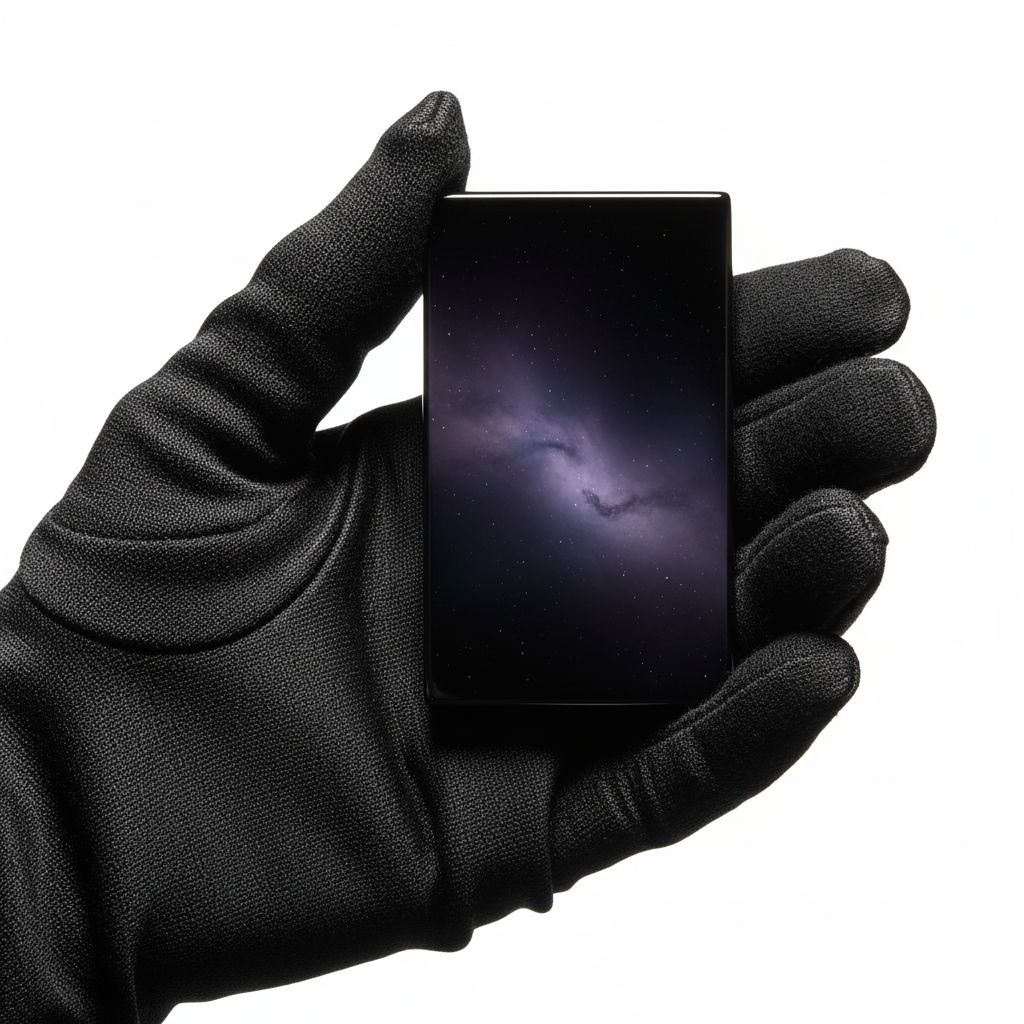 PROMPT: [R] Una mano enguantada con un guante de seda negra sostiene un pequeño monolito de obsidiana perfectamente pulido. [I] Estilo Editorial de Vogue/Minimalismo de lujo. El monolito refleja sutilmente un paisaje cósmico y nebuloso. [L] Iluminación de estudio top-down (cenital) para maximizar los reflejos en la obsidiana. Lente macro. [E] Paleta de color estrictamente limitada a negro mate, blanco hielo y púrpura cósmico suave. Enfoque nítido en la textura de la seda y el pulido del monolito.