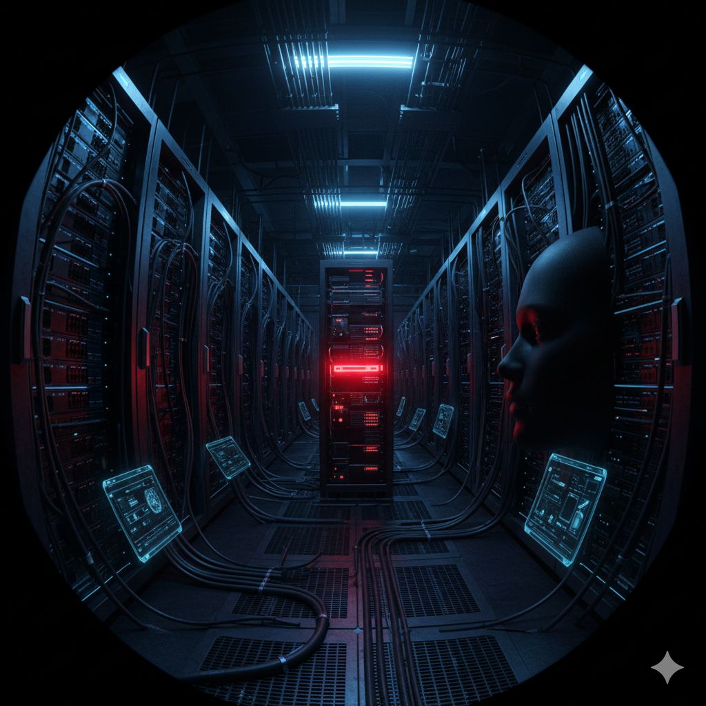 PROMPT: [R] Interior oscuro y futurista de un centro de datos. En el centro, un servidor emite una luz roja de advertencia. [I] Estilo Hard Sci-Fi / Industrial. La luz roja se proyecta sobre un rostro humano (sugerido, no explícito) en las sombras. [L] Tomas de gran angular y baja altura (ojo de pez sutil) para generar inmensidad, iluminación ambiental de neón azul y ese único punto de luz roja crítica. [E] Negros verdaderos y profundidad extrema, sin ruido visual, renderizado hiper-detallado.